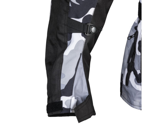Чоловіча мотоциклетна куртка W-TEC Troopa - це міцний - і завдяки камуфляжним візерункам, одночасно оригінальний - елемент одягу мотоцикліста. Зовнішній шар куртки виготовлений із суцільного поліестеру. Критичні місця (лікті, плечі) забезпечені знімними гумовими накладками. Куртка також має посилені панелі у верхній частині спини. У спекотні дні ідеально підходить вентиляція, що складається з 4 отворів, що регулюються на блискавках, а в холодні дні куртку можна одягнути на знімну підкладку. Розмір куртки можна регулювати за допомогою розтяжок на талії та рукавах для ідеального прилягання. Його вражаюча кількість кишень для всіх необхідних предметів додає практичності. Важливою перевагою є також ребристі еластичні панелі на ліктях, що покращують свободу рухів.