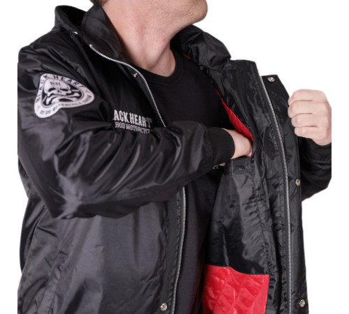 Чоловіча куртка Black Heart Barker з великим патчем байкера-стилем на спині. Еластичні подоли дозволяють ідеально прилягати, тоді як теплова підкладка, високий комір і капюшон натяжки стануть в нагоді в холодну погоду. У ньому є 5 кишень, в яких можна вмістити все необхідне. Цей привабливий піджак - це модна заява - він показує, що ви міцний хлопець, з яким ніхто не повинен возитися!