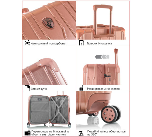 Валіза оснащена чотирма повноповоротними колесами Spinner з можливістю незалежного розвороту кожного колеса на 360°. Системою передбачено рівномірний перерозподіл навантаження на кожне колесо, що сприяє плавному руху і маневреності валізи, докладаючи при цьому мінімум зусиль. Можливість збільшити корисний обсяг валізи до 20% завдяки наявності системи Expansion System, розстебнувши спеціальну блискавку по периферії валізи.