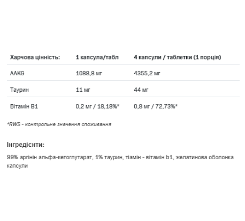 AAKG 1100 XTRACAPS - сучасний препарат, що містить аргінін альфа-кетоглутарат найвищої якості, таурин і вітамін B1.