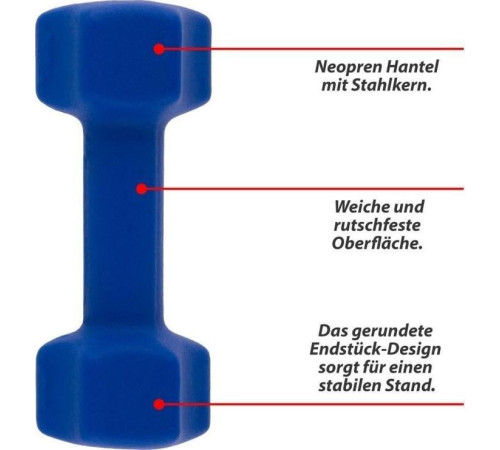 Оптимальні гантелі для використання в залі та вдома, підходять для тренування грудей, рук, біцепсів і трицепсів. Гантелі покриті шаром неопрену, який створює м'яку та нековзку поверхню, яку легко та зручно тримати та стійку до поту. Серцевина з високоякісної сталі гарантує тривалий термін служби. Заокруглена конструкція наконечників забезпечує стабільне положення, що забезпечує безпеку та запобігає скочуванню. Неопренове покриття запобігає пошкодженню підлоги або місця для зберігання.