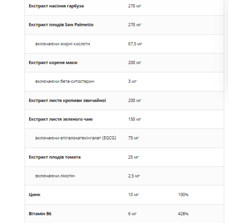 Дієтична добавка для чоловіків для поліпшення роботи передміхурової залози та сечовидільної системи. Він містить цілих 6 натуральних інгредієнтів, які можуть допомогти полегшити симптоми простати, такі як часте сечовипускання, дискомфорт, біль і проблеми з сечовипусканням. Екстракт гарбуза підтримує хорошу роботу сечового міхура та простати. Екстракт Saw Palmetto підтримує здорову функцію сечовивідних шляхів при доброякісній гіперплазії простати. Екстракт кореня маки допомагає підтримувати здоров'я простати завдяки бета-ситостерину. Екстракт кропиви звичайної підтримує видільну функцію нирок. Екстракт зеленого чаю захищає тканини і клітини організму від окисного пошкодження. Лікопін з томатного екстракту має антиоксидантну дію. Целюлозні капсули, які підходять для веганів і вегетаріанців, набагато ніжніші для шлунка, ніж класичні желатинові капсули. Продукт не містить додаткових наповнювачів.
