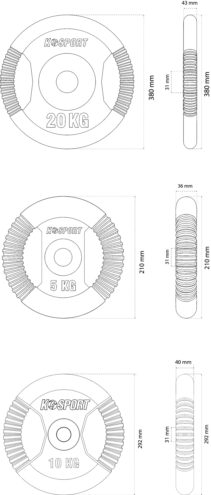 Встановлення вантажу полегшено завдяки спеціально розробленій системі. Перфоровані ручки з обох сторін полегшують перенесення ваги. Крім того, навантаження вагою 5, 10, 20 кг розроблено для використання як гирі. Тепер ви можете виконувати присідання, махи та вправи практично для кожної частини тіла з вагою K-SPORT.