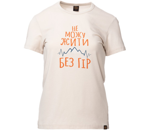 Оновлена жіноча футболка, яка так і кличе у мандри. Модель Gory 3 із текстовим принтом ”Не можу жити без гір” зручна, приємна до тіла та на 95% складається з бавовни. Вона підійде як для подорожей, так і для повсякдення.