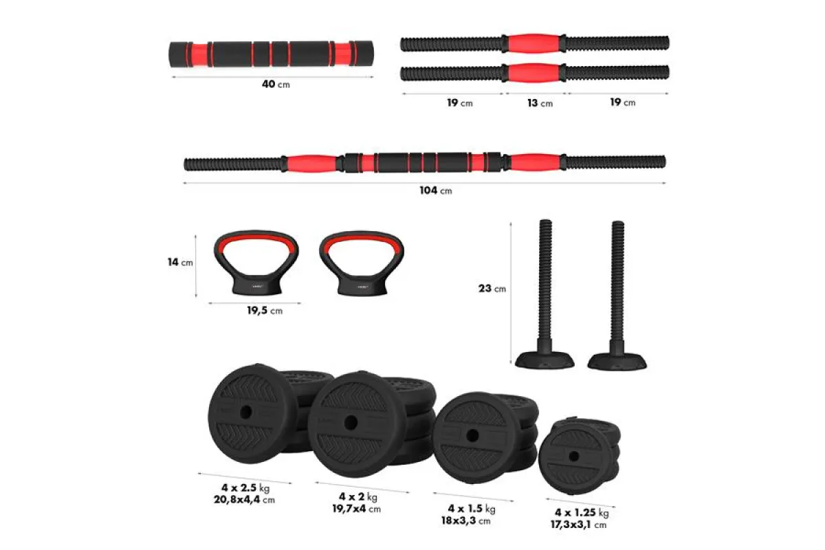 SGN130 PRO SET 6IN1 WEIGHT SET 30KG HMS SGN 6в1 Це революційний продукт від HMS, який дозволяє виконувати кілька силових вправ з одним комплектом обладнання. SGN 6w1 складається з шістнадцяти пластин, двох коротких грифів, одного подовжувача грифів, двох ручок і двох підставок для гир і затискачів. Ви можете використовувати їх для створення наступних інструментів:
