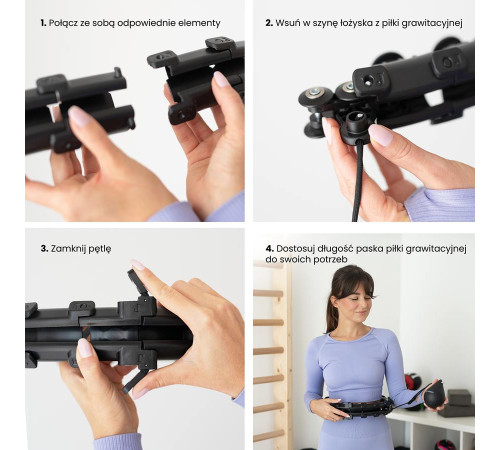Розкриваємо петлю за допомогою магнітних затискачів. Потім, щоб з'єднати наступні елементи, вставте один елемент в інший так, щоб виступи помістилися у відповідні отвори. Зменшуючи елементи, візьміть відповідний елемент однією рукою та стисніть, щоб видалити виступи з отворів. Потім вставте гравітаційну рейку в петлю, закрийте затискачі магнітом, відрегулюйте довжину ремінця і все. Крім того, завдяки компактним розмірам його легко носити з собою, ви можете брати з собою всюди.