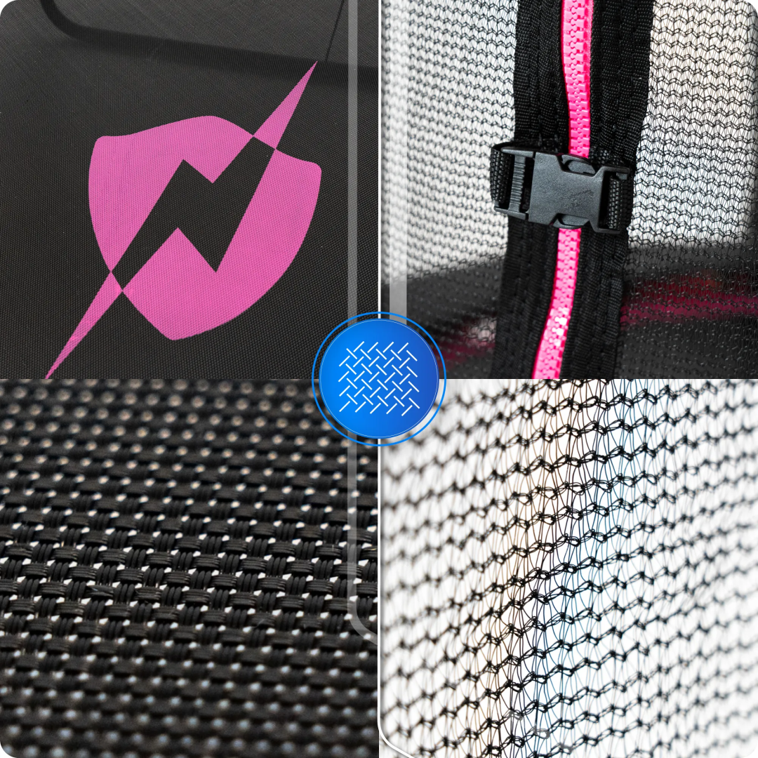 Захисна сітка виготовлена з щільно сплетеного, міцного матеріалу з міцною текстурою, стійкого до розтягування та атмосферних умов. Відповідне натягнення по всьому периметру забезпечує стабільність та відсутність люфтів під час використання. Міцне кріплення до рами батута значно підвищує безпеку та запобігає випаданню за межі зони стрибка.