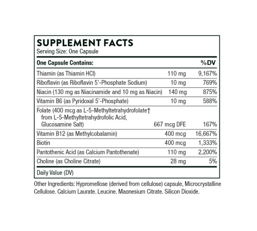 Формула Thorne's Basic B Complex містить активні форми вітамінів групи B, що полегшує їхнє засвоєння організмом. Ця комплексна суміш забезпечує численні переваги для підтримки вашого способу життя, наприклад допомагає перетворювати їжу на паливо та покращує клітинну енергію.* Оскільки більшість вітамінів групи В не залишаються в організмі, їх потрібно отримувати з дієти та добавок, щоб підтримувати оптимальне здоров’я. *
