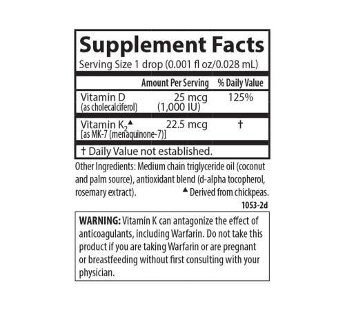 Kid's Super Daily ® D3 + K2 поєднує в собі дві найважливіші поживні речовини для підтримки оптимального здоров'я кісток, зубів і серцево-судинної системи. Вітамін D3 важливий для транспортування та засвоєння кальцію, а МК-7 має вирішальне значення для формування міцної кісткової матриці. MK-7 також підтримує здорове згортання крові, здоров'я артерій і роботу серцево-судинної системи. MK-7, що міститься в Kid's Super Daily ® D3 + K2, є натуральним і має високу біодоступність. Забезпечте своїх дітей поживними речовинами, необхідними для оптимального здоров'я кісток, за допомогою Kid's Super Daily ® D3 + K2. Одну концентровану краплю можна додати в їжу чи напій вашої дитини. Вітамін K2 у вигляді MK-7 у Kid's Super Daily ® D3 + K2 складається з MenaQ7, єдиного MK-7, який клінічно вивчено та має позитивний вплив на кістки та серцево-судинну систему.