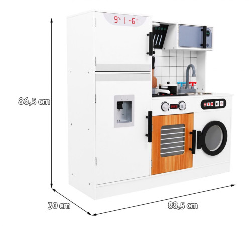 Велика дитяча кухня, виготовлена з натурального дерева і пофарбована безпечними фарбами, - відмінний варіант для дітей від 3 років . Маленький кухар зможе вільно відкривати всі дверцята - в холодильнику з морозильною камерою , пральній машині , плиті та мікрохвильовій печі . Навіть ручки на плиті і крани рухливі.
