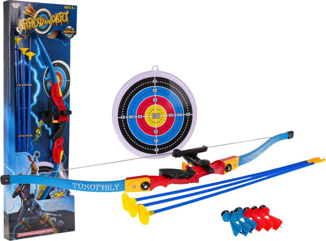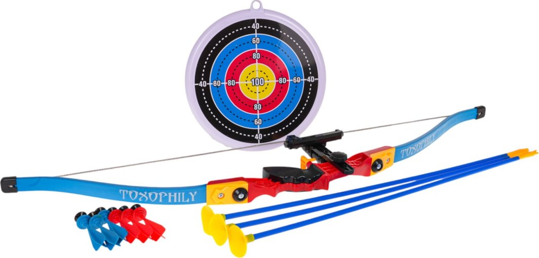 Набір лук, болти, мишень і дротики для дітей від 3 років. Лук дуже простий у використанні, просто помістіть стрілу між прицілом і тятивою, наведіть на ціль і стріляйте. У набір також входять дротики з присоскою, які також можна метати в ціль. Мішень має гумову присоску. Гра з набором вчить точності та зосередженості, а також є відмінним тренуванням для м'язів плечей і спини