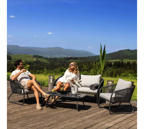 Садові меблі Paso від Di Volio - це ідеальне поєднання функціональності та сучасного стилю. Комплект складається з просторого двомісного дивана і двох крісел, сидіння і спинки яких оснащені товстими м'якими подушками, журнального столика зі скляною стільницею. Меблева конструкція, виготовлена з гнутих сталевих труб графітового кольору та ручного плетення техноротангу того ж відтінку, дуже міцна, стабільна і, перш за все, стійка до зовнішніх погодних факторів, таких як дощ, інтенсивне сонце (УФ-промені), сніг або волога. Прості, модерністські форми меблів і стримані кольори роблять гарнітур Paso чудовим практично в будь-якій композиції, а ваш сад або тераса стануть вашим улюбленим місцем відпочинку на природі.