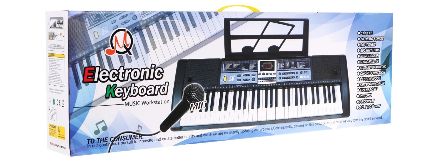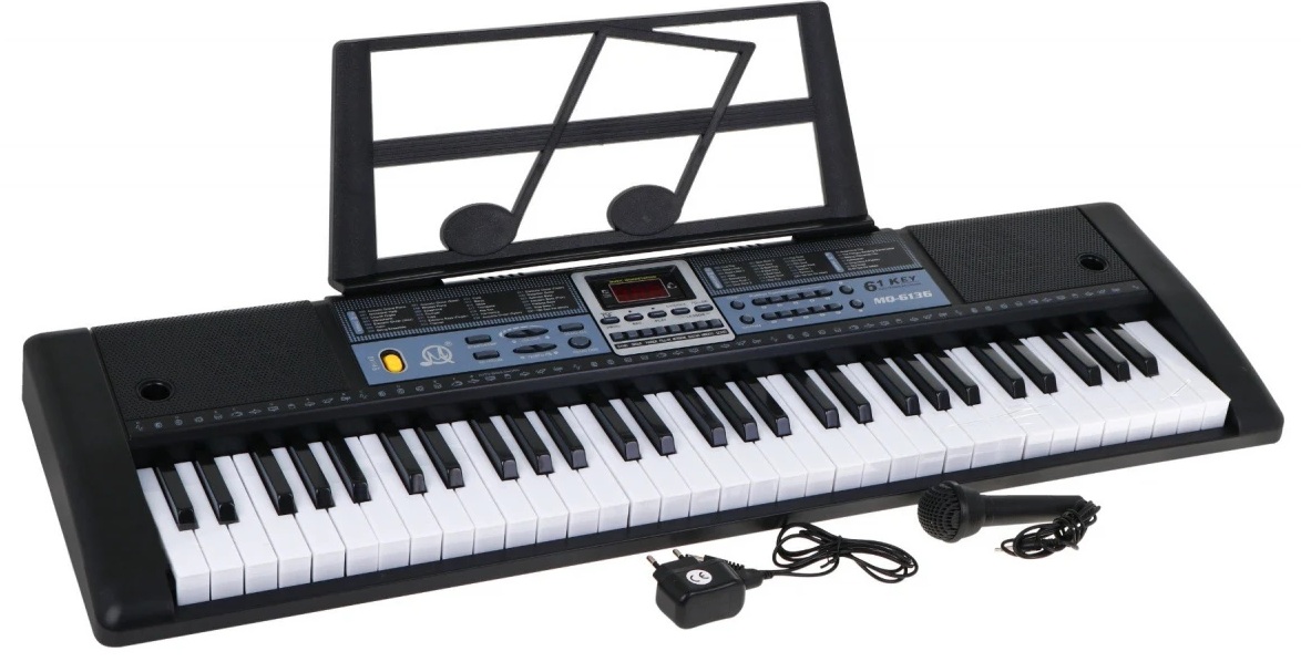 Синтезатор для дітей віком 5-8 років. Музична іграшка має 61 клавішу, яких достатньо для ефективного навчання грі. У вивчення звуків і нот допоможуть вбудовані функції. До комплекту додаються аксесуари, такі як мікрофон для співу та підставка для нот, яку можна встановити у верхній частині інструменту. Про хорошу якість звуку дбають 2 вбудовані динаміки.