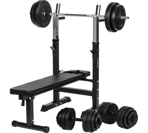 Лава для штанги регулюється в п'яти положеннях з вбудованими ручками. Завдяки складаним ніжкам штангу можна використовувати як похилу лаву з ременем для ніг. При необхідності лавку можна скласти та зберігати, завдяки своїм розмірам вона не займає багато місця. Технічні дані: висота стійки для штанги: приблизно 92 - 112 см. Вага лави: приблизно 17 кг максимальна вантажність стійки та штанги: 200 кг (включаючи вагу тіла) габаритні розміри лави: 118 x 54,5 x. Сидіння 112 см: 110 x 25 x 5 см. Висота сидіння від землі: 45 см. Товщина сидіння: 5 см. Складена лава: 54,5 x 132 x 52 см. Вміст упаковки: 1 х тренажерна лава, набір штанг, 30 кг, набір гантелей для однієї руки 2 х 15 кг