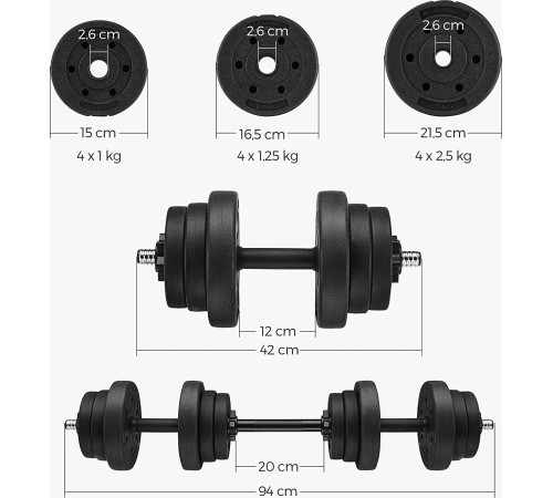 - Гнучке використання: Загальна вага з аксесуарами: 20 кг, включаючи 4 диски по 2,5 кг, 4 диски по 1,25 кг, 4 диски по 1 кг, 2 штанги для гантелей, 4 зірочки та штангу до 2 гантелей по 10 кг або 20 кг штанга