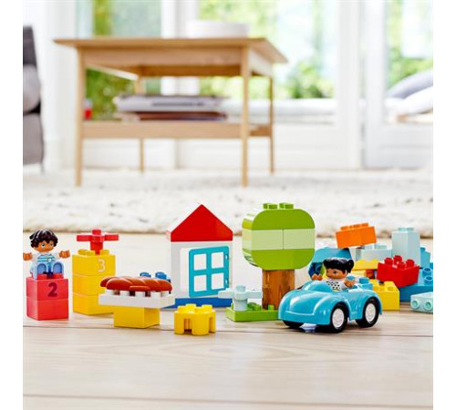 Цей набір LEGO® DUPLO® відкриває перед малюком яскравий світ ідей для творчості та розвитку. Він універсальний та стане невичерпним джерелом натхнення. У наборі є машинка з колесами, що крутяться, дах, віконце, квіти, буханець хліба та інші предмети, що дозволяють придумати безліч ігрових сюжетів. А також кубики з цифрами 1, 2 та 3 для першого знайомства з рахунком.