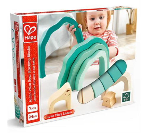 Дерев'яна пірамідка Hape Ведмедик містить 7 блоків неправильної форми. Створюйте дивовижні арктичні пейзажі та вигадуйте історії серед айсбергів!