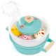 Це дитячий набір для приготування гарячих страв із реалістичним звуком та ефектом водяної пари. Включає одну пароварку з кришкою і ситом, 2 ложки, листя салату, шматочки цибулі, грибів, креветок, перцю, помідора та інші продукти, а також 4 милих персонажі: зайчика, свинку, тигра, курча.