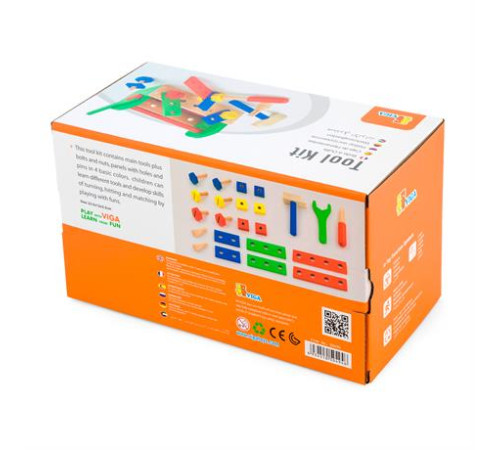 Розмір ящика з ручкою 25 х 14 х 12 см. У ньому зручно зберігати та переносити різноколірні інструменти з деталями: молоток, гайковий ключ, викрутку, планки різної довжини з отворами, болтики та гайки. Ігровий набір виконаний із міцної деревини із застосуванням гіпоалергенних фарб. Краї згладжені та відшліфовані начисто. Розвивальний дерев'яний набір відповідає міжнародним сертифікатам безпеки та якості дитячих іграшок: європейському EN71 і американському ASTM, як і вся продукція Viga Toys.