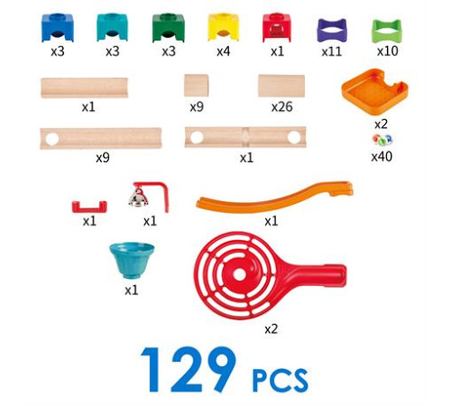Приготуйтеся до перегонів з конструктором-лабіринтом Hape! До комплекту входить 129 елементів, серед яких 35 блоків, 47 доріжок, 40 мармурових кульок, 2 великих помаранчевих блока, 1 затиск, 1 дзвіночок, 2 пастки для куль, кошик для лову кульок.