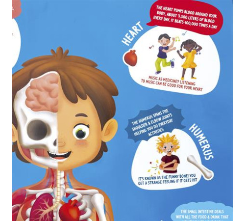 В комплект входять 50 пазлів, 10 дерев'яних елементів у вигляді людських органів, постер з картинками та смішними фактами про наше тіло англійською мовою та зручну валізку для зберігання.