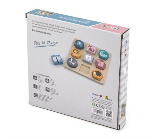Дитина цікаво проведе час із дерев'яним пазлом PolarB Форми та звірята. Пазл складається з квадратної підставки 20 см із виїмками для укладання 18 блоків – частин фігур. Розвивальна іграшка зацікавить дітей переддошкільного віку від 18 місяців.