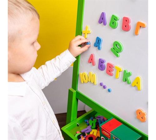 Усі магнітики м’які та об’ємні. Ними можна гратися на будь-якій магнітній поверхні. Деякі літери дублюються. Коли дитина вивчить абетку, можна складати з магнітів невеликі слова та читати їх.