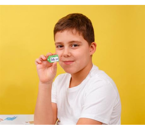 Комплектація: 78 деталей, 40 паперових купюр, 4 списки покупок, 21 картка із завданням, 1 колесо удачі, інструкція.