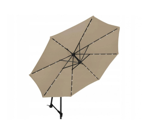 Основний шар парасолі виконано з поліестеру, який зустрічається у звичайних побутових парасольках, проте має підвищену щільність. Краплини води стікатимуть без промокань, Пекуче сонячне проміння залишиться на зовнішній стороні, а шар мокрого снігу на поверхні не зможе завдати суттєвої шкоди. 32 LED лампи, що живляться від сонячної панелі одразу створюють бажану атмосферу. Якщо потреба у парасолі наразі зникла, належне тимчасове зберігання допоможе підтримати спеціальний чохол, що постачається в комплекті.