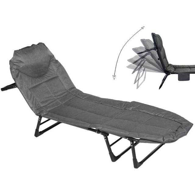 Стильний темно-сірий колір завжди має гарний вигляд, пасує більшості дизайнерських рішень. Положення спинки регулюється за кутом нахилу від лежачого до сидячого положення. Додаткову зручність забезпечує бокова кишеня в яку можна покласти телефон, ключі й інші дрібнички. Цей елемент також виготовлено з тканини 600D, то ж можна не хвилюватись за цілісність речей через вплив сонячних променів чи бризки води з басейну.