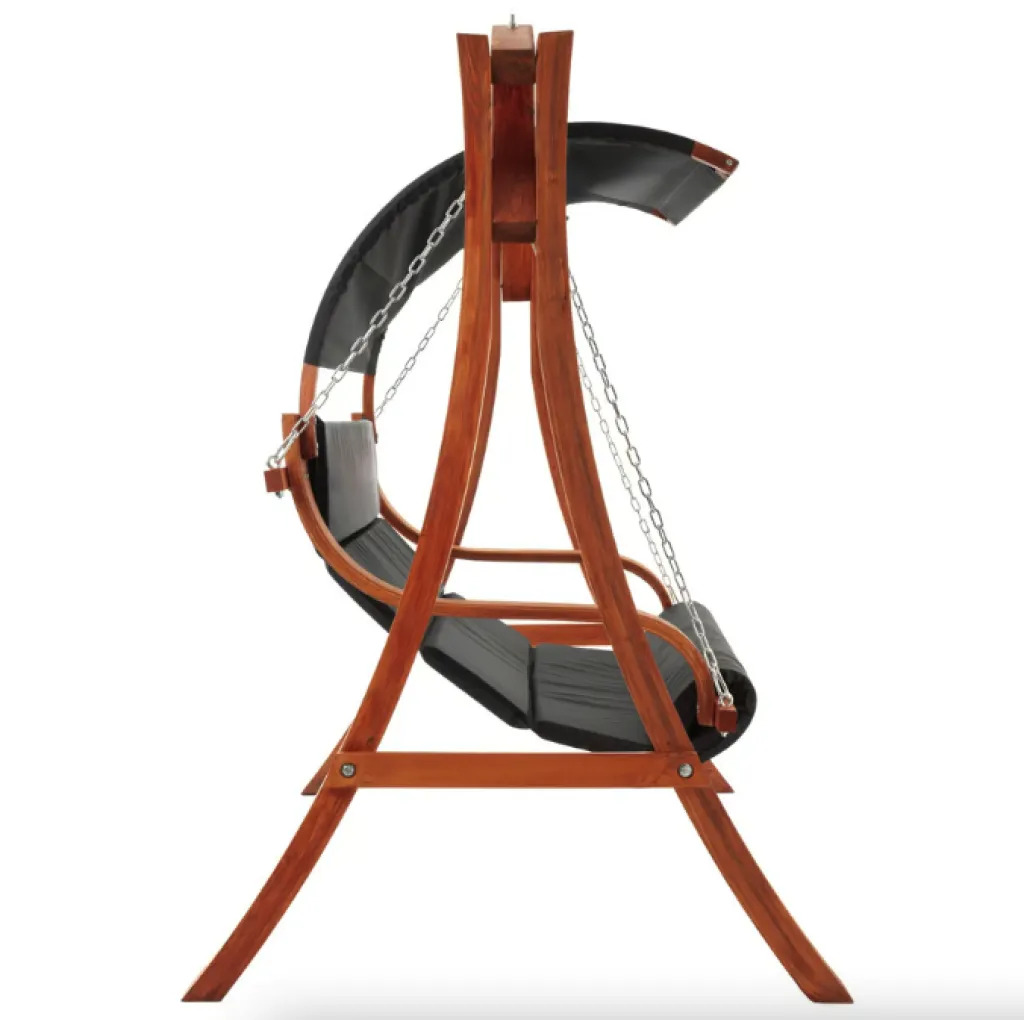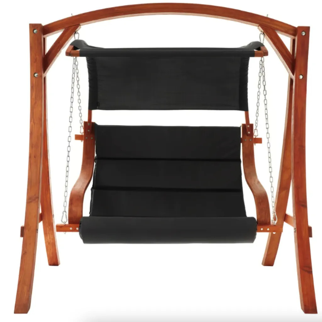 Гойдалка має виразний декоративний вигляд завдяки поєднанню темних відтінків деревини та текстилю. Вона стане стильним акцентом у саду, на терасі чи в зоні відпочинку, створюючи атмосферу затишку та спокою. У комплект входить тепла флісова ковдра, яка робить відпочинок комфортним навіть у прохолодні вечори.