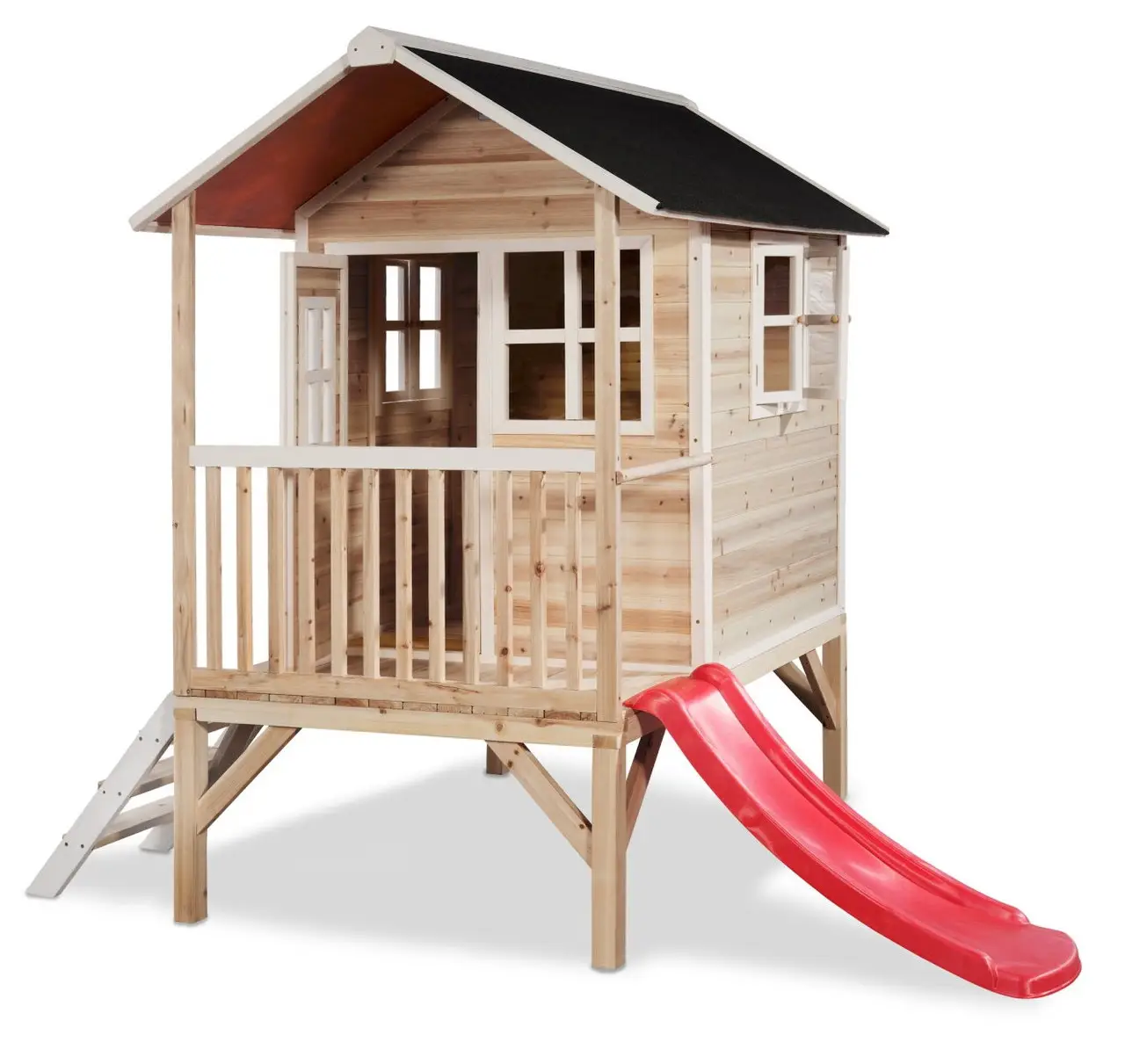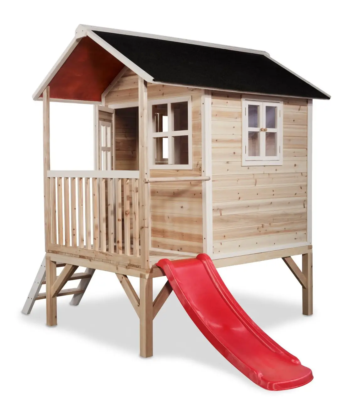 Виготовлений із сертифікованої FSC деревини кипариса, будиночок гарантує безпеку та довговічність. Це дерево стійке до впливів погодних умов і не схильне до тріщин, що робить конструкцію надійною навіть при тривалій експлуатації. Водонепроникна бітумна покрівля захистить будиночок від дощу, дозволяючи дітям насолоджуватись грою за будь-якої погоди – без необхідності додаткової обробки!