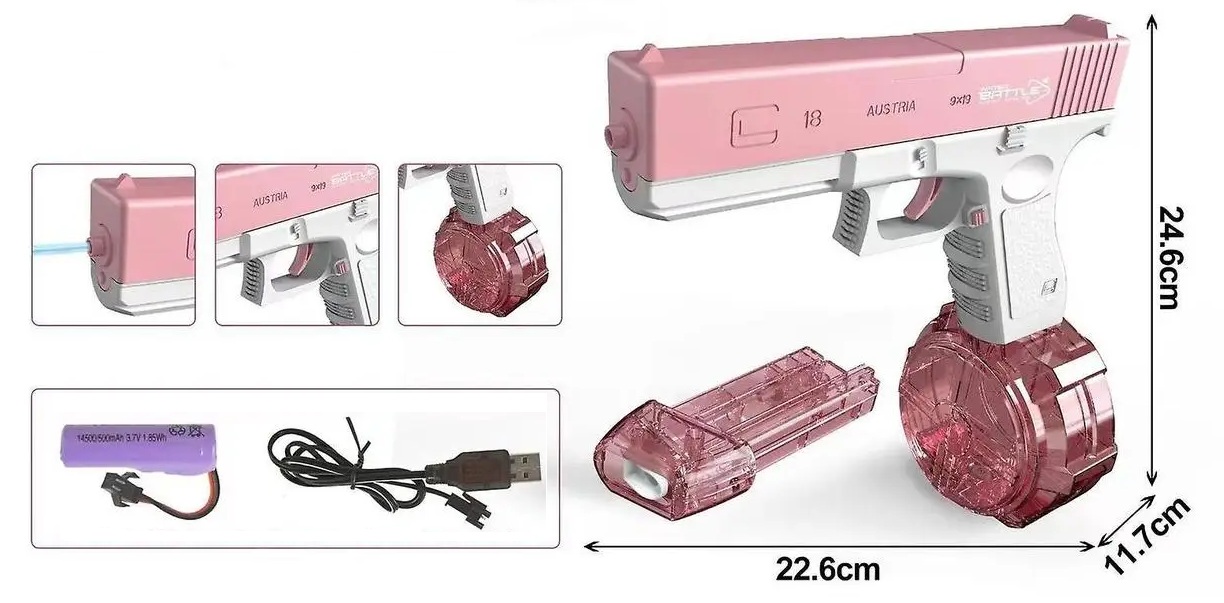В комплекті: пістолет, акумулятор, USB кабель, два резервуари для води.