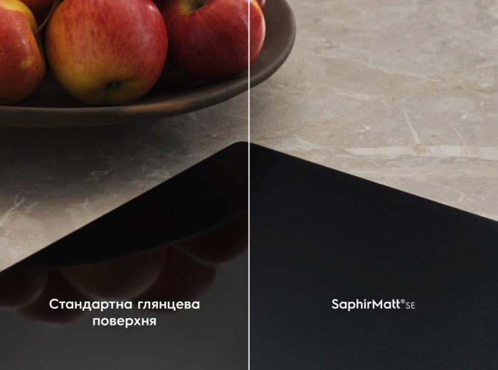 Матово-чорне покриття SaphirMatt SE додає кухні стриманої елегантності. Воно більш стійке до подряпин, ніж звичайні склокерамічні поверхні, завдяки чому виглядає бездоганно навіть при постійному використанні.