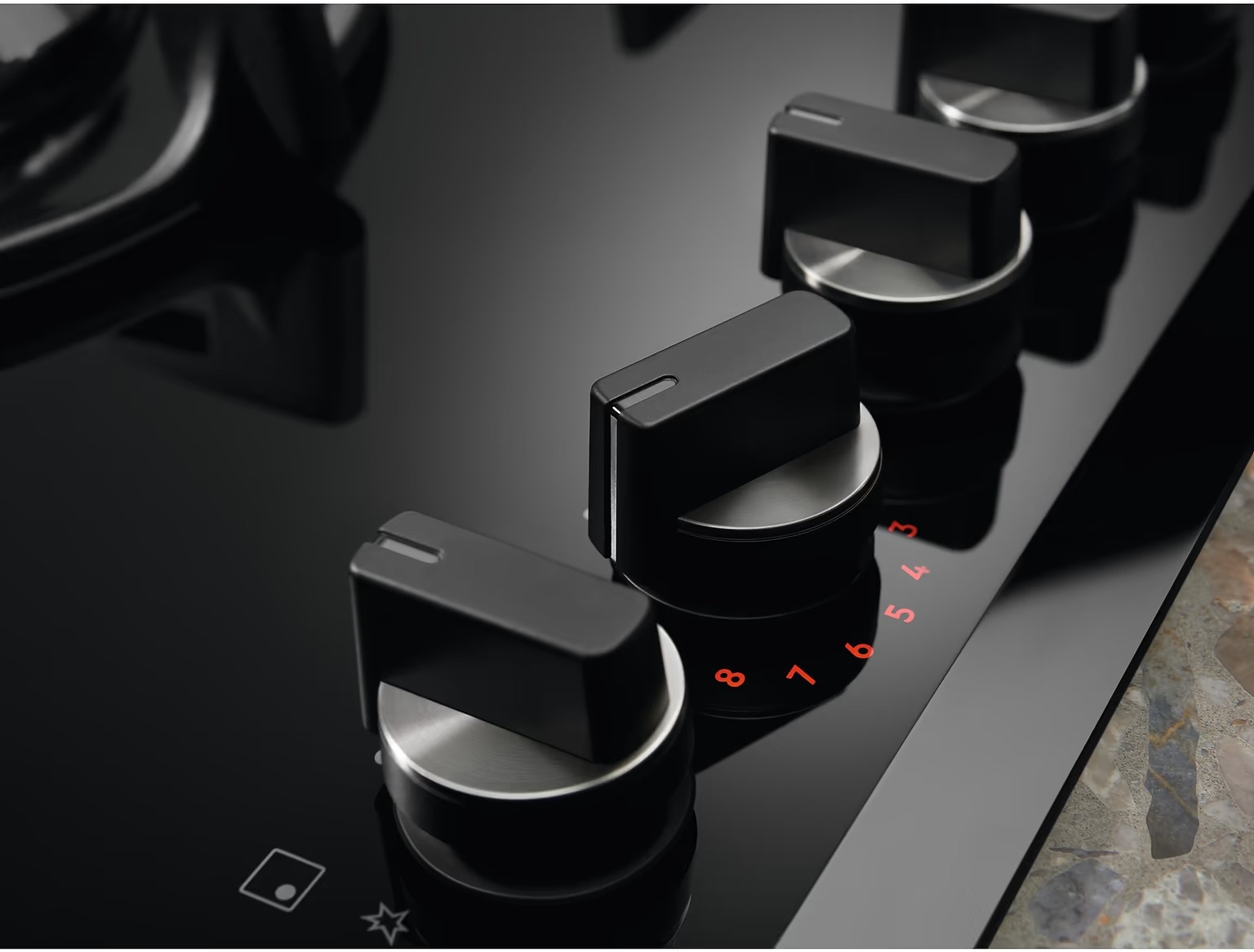 Варильна поверхня газова ELECTROLUX KGG643753K. Світлодіодні індикатори газової варильної панелі FlameLight показують, коли конфорка увімкнена або вимкнена. Вони також дозволяють контролювати та вибирати між дев'ятьма рівнями потужності пламени, легко налаштовуючи інтенсивність пламені під час готування.