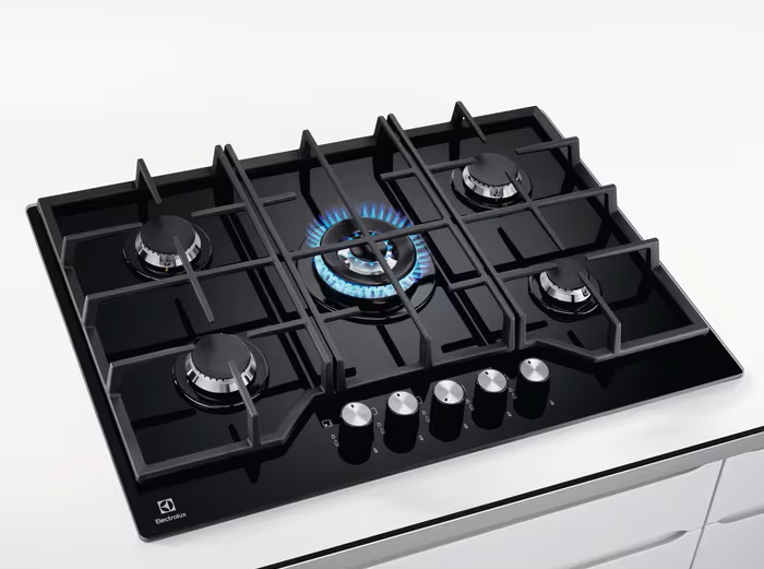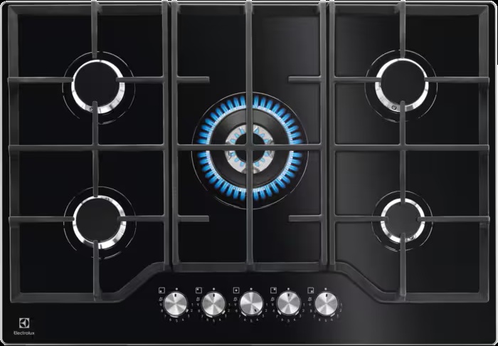 Варильна поверхня газова ELECTROLUX KGG75362K. Варильна поверхня має нестандартний п'ятиконфорковий дизайн і надає сучасного вигляду будь-якій кухні. Гладку поверхню із загартованого скла легко утримувати в чистоті, і виглядає така поверхня просто чудово.