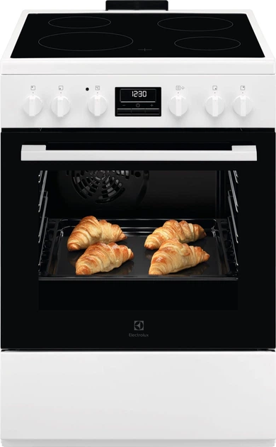 Плита електрична ELECTROLUX LKR664177W. Технологія SteamBake забезпечує оптимальну вологість, завдяки чому тісто піднімається повністю, створюючи м’яку середину та хрустку золотаву скоринку, як у професійній пекарні. Додаткове нагрівальне кільце дозволяє одночасно готувати на двох деко, забезпечуючи рівномірне пропікання та насичений смак страв. Функція каталітичного очищення автоматично активується при досягненні 250 °C, видаляючи залишки їжі та жир, що значно спрощує догляд за духовкою. Таймер відключає нагрів після досягнення заданого часу, запобігаючи пересмаженню страв і забезпечуючи точне приготування. Керамічні зони нагріву швидко й рівномірно прогріваються, що дозволяє швидко готувати страви та легко очищати поверхню після використання.