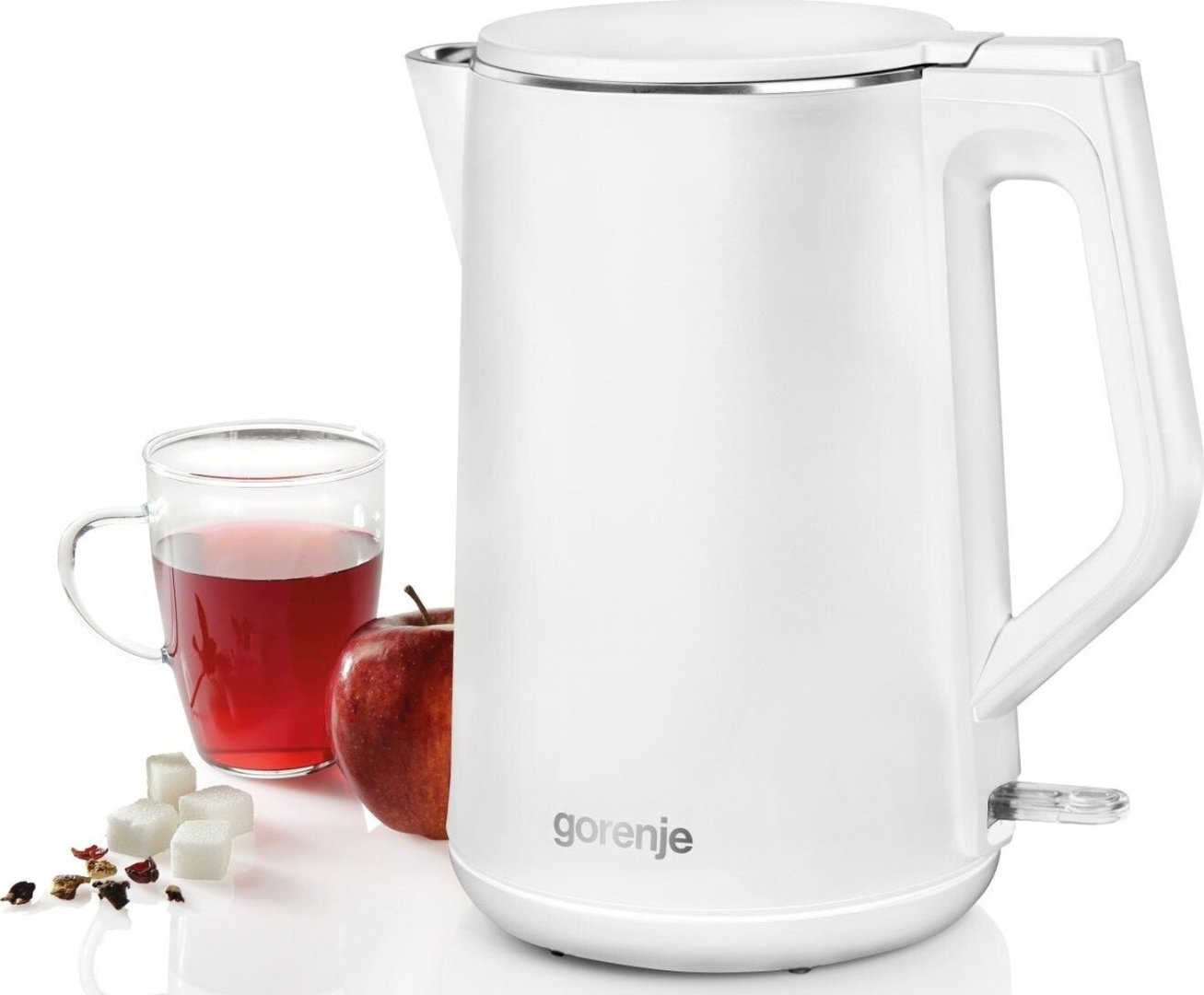 Електрочайник Gorenje K15DWBK. Завдяки подвійній стінці й особливому повітряному прошарку між внутрішнім і зовнішнім покриттям до корпусу цього чайника можна безпечно доторкатися. Якщо у вас на кухні перебувають діти, вони будуть у безпеці, оскільки ззовні чайник холодний.