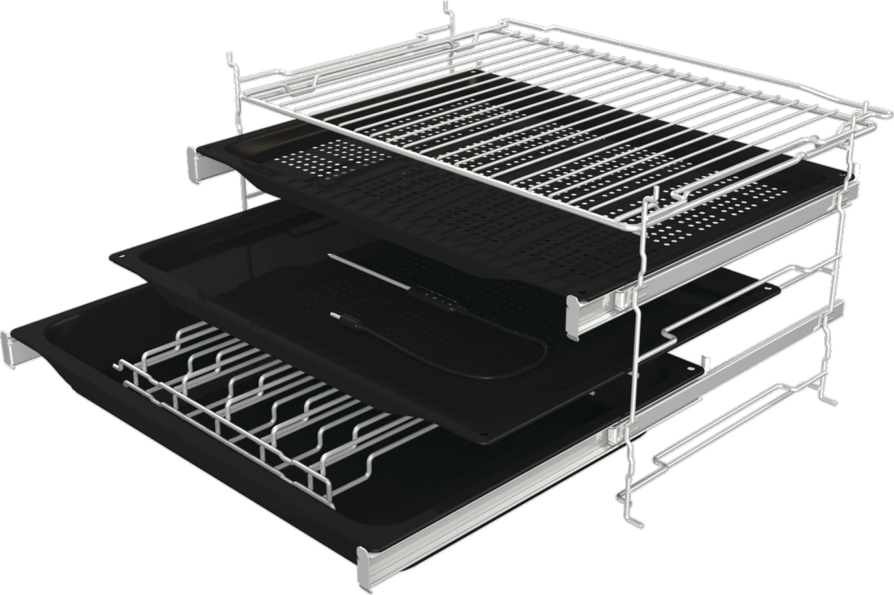 Комплектація включає глибоке емальоване деко, мілке емальоване деко, емальоване деко з перфорацією, температурний зонд, решітку, дротяні напрямні, частково висувні дворівневі телескопічні напрямні, комплект кріплень для монтажу та інструкцію з експлуатації.