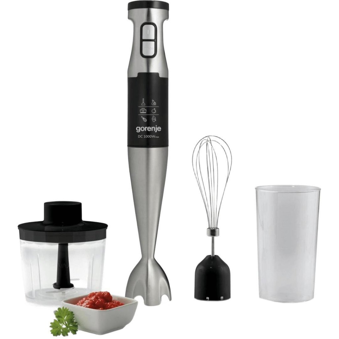 Блендер GORENJE HBX 1000 E - ідеальний помічник на кухні. Модель з великим набором додаткових аксесуарів. За допомогою змішувальної насадки з нержавіючої сталі можна легко приготувати ідеальні пюре, соуси, смузі, супи тощо. Насадка для збивання кріпиться одним рухом. Це зручно, коли потрібно збити яйця або вершки. Подрібнювач з чашею об'ємом 500 мл ефективно подрібнює тверді продукти на дрібні шматочки.