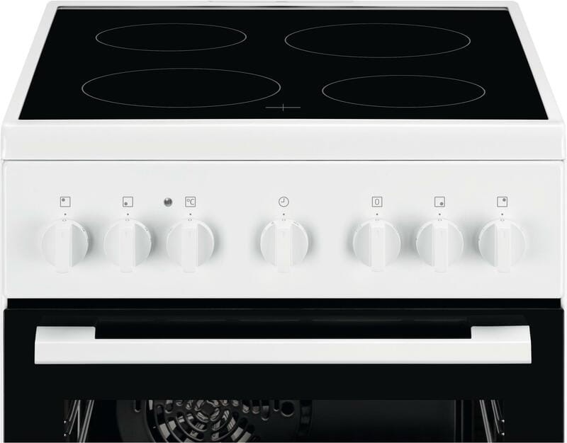 Модель виконана в класичному білому дизайні, який легко інтегрується в будь-який інтер’єр кухні. Для догляду за поверхнею використовується міцна склокераміка, що легко очищується. Дверцята духовки мають два скла для безпеки та підвищення енергоефективності.