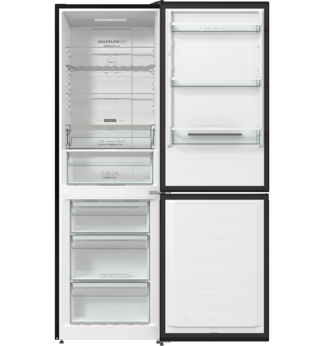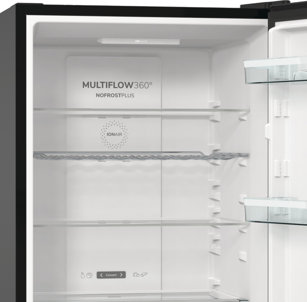 Технологія IonAir створює негативно заряджені іони, які рівномірно розподіляються в холодильній камері за допомогою системи MultiFlow 360°. Повітря, збагачене аніонами, сприяє збереженню природного аромату продуктів і усуненню неприємних запахів, забезпечуючи оптимальний мікроклімат на кожній полиці.
