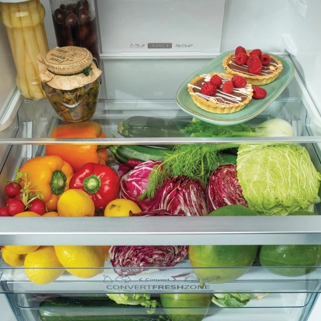 Шухляда Convert FreshZone легко змінює призначення зі зберігання м’яса та риби на контейнер для фруктів і овочів, що дозволяє ефективно розмістити всі свіжі продукти.