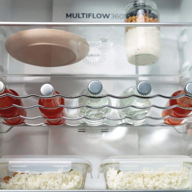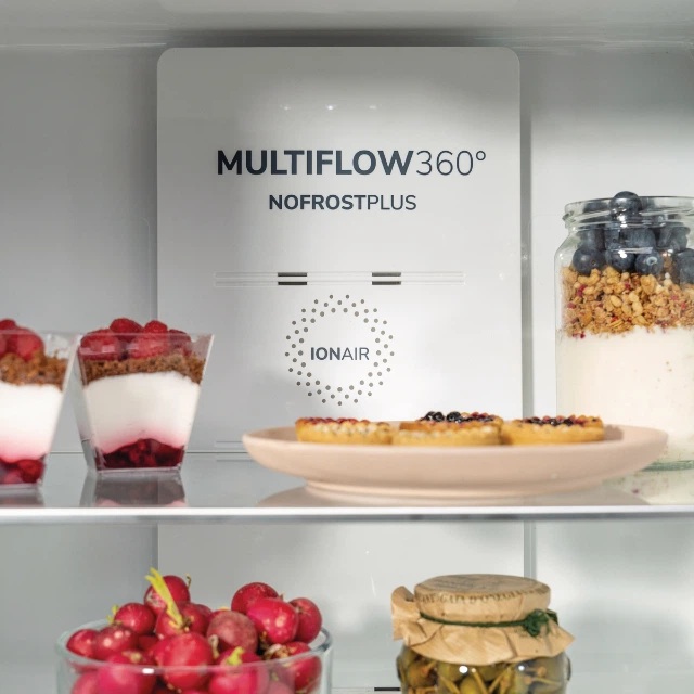 Технологія IonAir створює негативно заряджені іони, які рівномірно розподіляються по всій холодильній камері за допомогою системи MultiFlow 360°. Таке повітря підтримує аромат продуктів і усуває неприємні запахи.