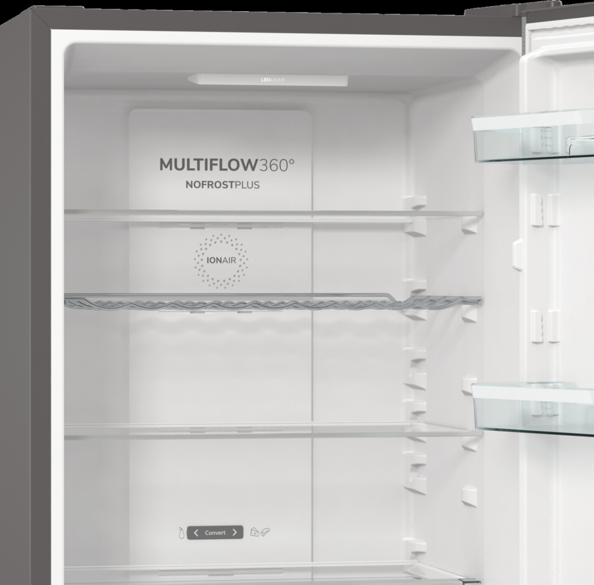 Технологія IonAir створює негативно заряджені іони в приладі, які рівномірно розподіляються в холодильній камері за допомогою системи MultiFlow 360°. Збагачене аніонами повітря сприяє збереженню аромату продуктів і усуненню неприємних запахів, забезпечуючи оптимальний мікроклімат на кожній поличці.