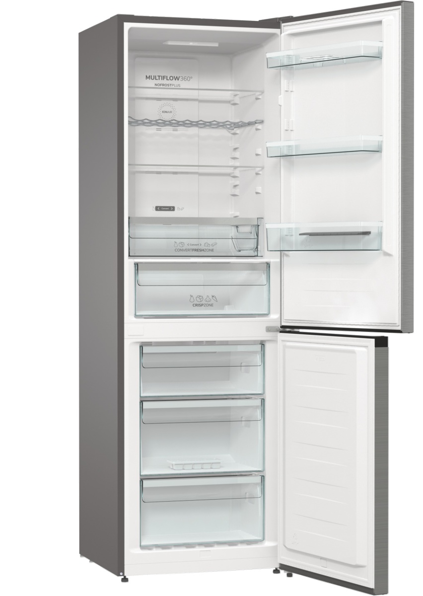 Холодильник комбінований GORENJE NRK 6192 AXL4. Одна з найкращих систем охолоджування на ринку, встановлена в морозильній камері, запобігає накопиченню льоду та інею, що сприяє зниженню споживання електроенергії. Завдяки цьому простір використовується оптимально, а морозильну камеру не потрібно розморожувати й мити. Пакунки та окремі заморожені продукти не злипаються, що дозволяє підтримувати порядок у морозильній камері.