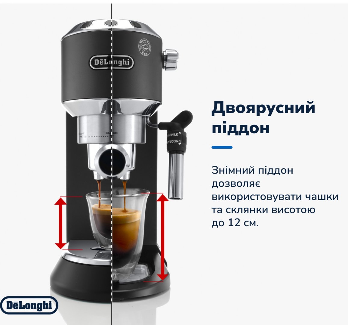 Кавоварка DeLonghi EC 685 має знімний піддон, який дозволяє використовувати для приготування чашки висотою до 12 см.