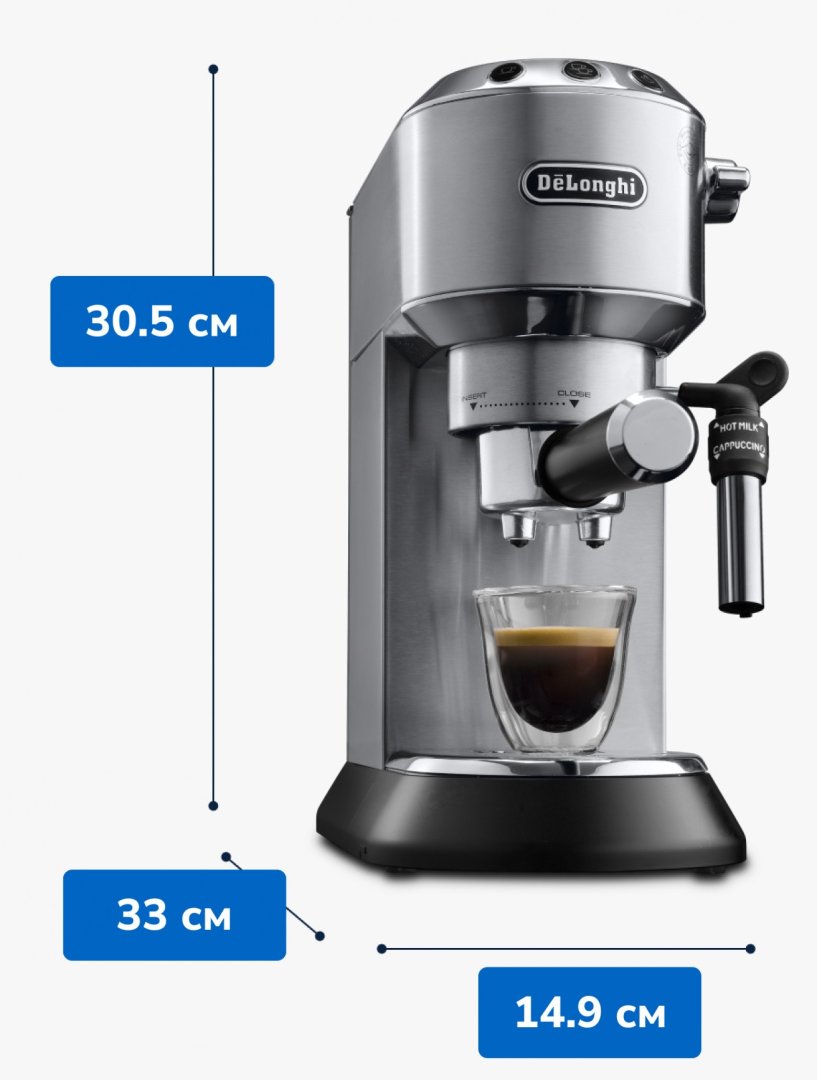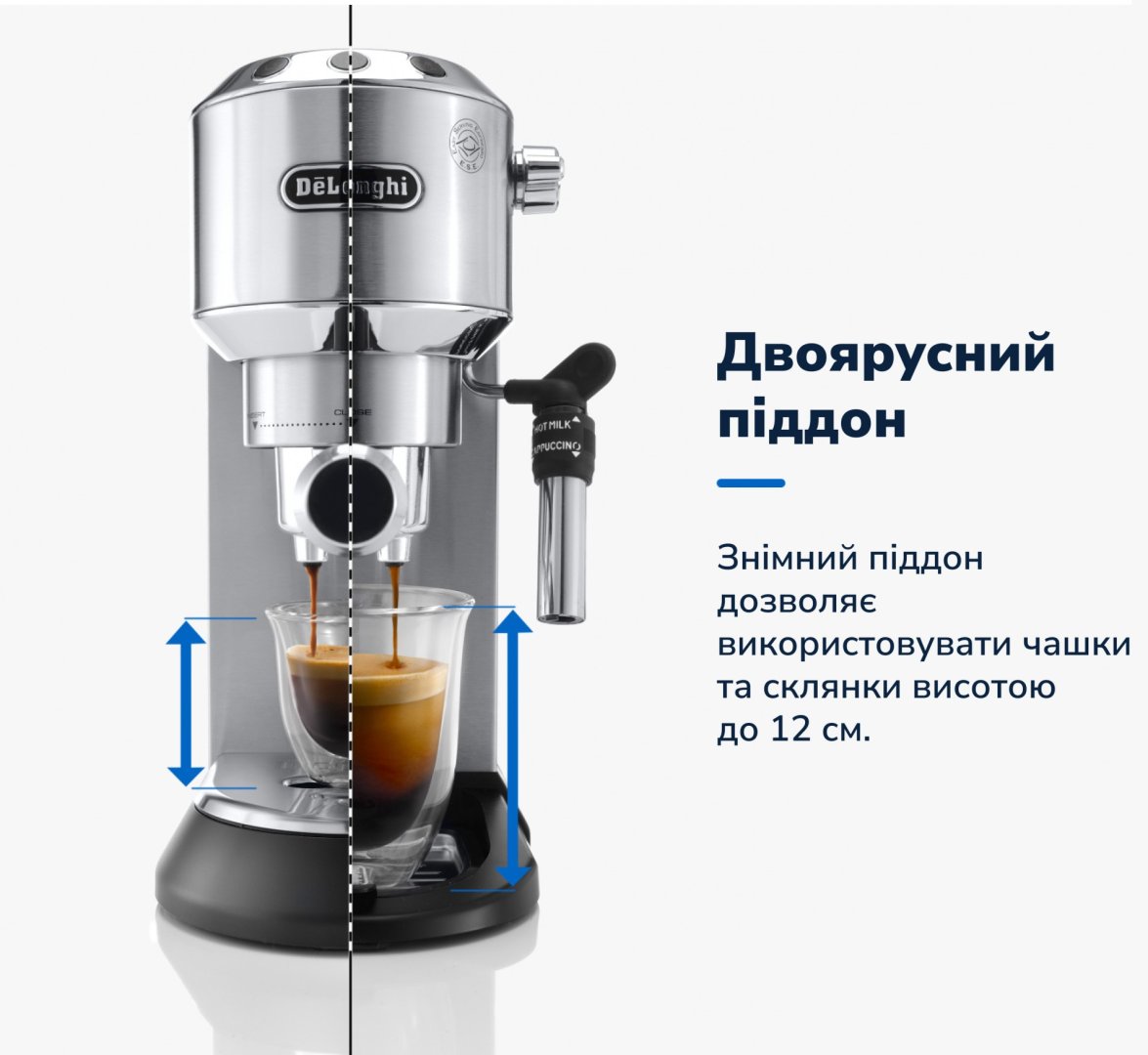 Ширина корпусу кавоварки всього 15 см, це робить її найтоншою моделлю в лінійці кавоварок Delonghi - вона легко вміщується навіть у невеликому просторі. Стильне поєднання металевого корпусу та хромованих елементів перетворює кавоварку на декоративну прикрасу вашої кухні. І ще одна особливість: спеціальна верхня панель підігріває чашки, адже правильний еспресо потрібно готувати у теплих чашках.