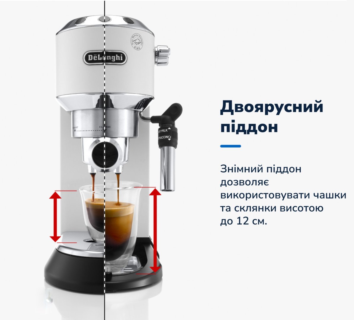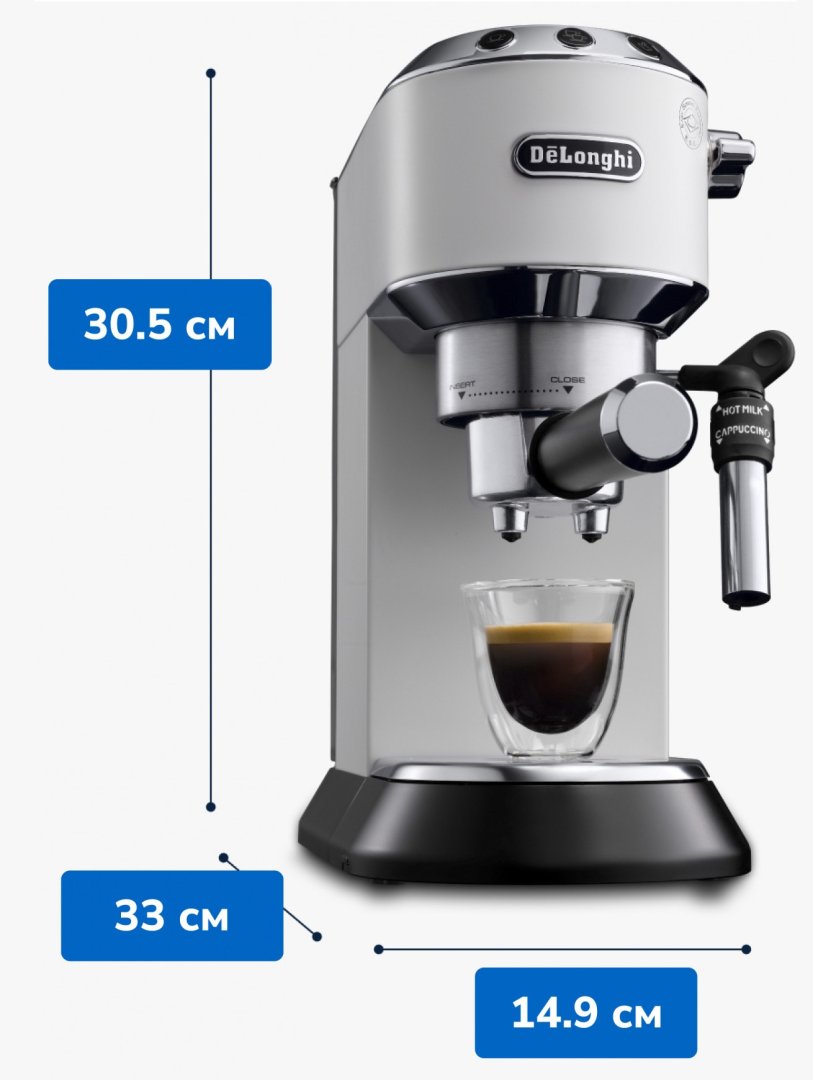 Ширина корпусу кавоварки всього 15 см, це робить її найтоншою моделлю в лінійці кавоварок Delonghi - вона легко вміщується навіть у невеликому просторі. Стильне поєднання металевого корпусу та хромованих елементів перетворює кавоварку на декоративну прикрасу вашої кухні. І ще одна особливість: спеціальна верхня панель підігріває чашки, адже правильний еспресо потрібно готувати у теплих чашках.