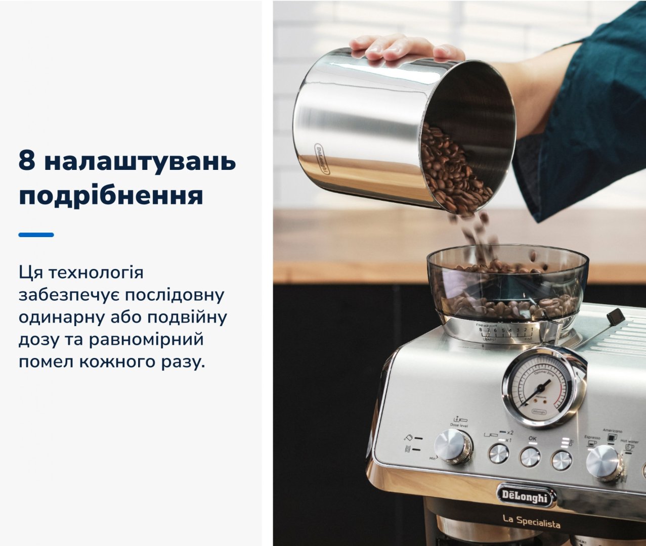 Перед кожним приготуванням безшумна кавомолка з міцними жорнами меле саме ту кількість зерен, яка потрібна на порцію, не перегріваючи зерна в процесі помелу – саме так кава зберігає максимум аромату та смаку. Вибирайте 1 з 8 ступенів помелу, щоб досягти ідеальної екстракції смаку для кожної порції кави.